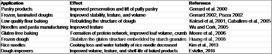 | Gluten-free baking | Formation of protein network, improved loaf volume, crumb | Moore et al, 2006 |