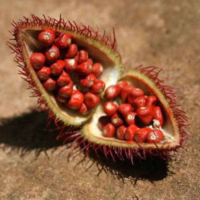 Bixa orellana is native to tropical regions such as Brazil, India, Kenya, Peru, and the Caribbean. Extracts from this plant were originally used as a medicine to treat heartburn or gastric distress, as a sunscreen or for body painting.