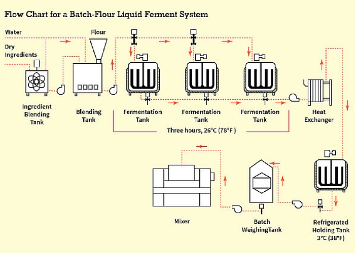 In flour brews, the fermentation step occurs in a liquid medium which is then pumped to be chilled, stored, and then mixed with the rest of flour and other ingredients to form the desired plastic dough.