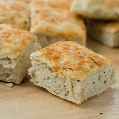 Focaccia is usually made by using sourdough or yeast preferments. Parmesan cheese is often added to the dough side to impart an extra flavor dimension.