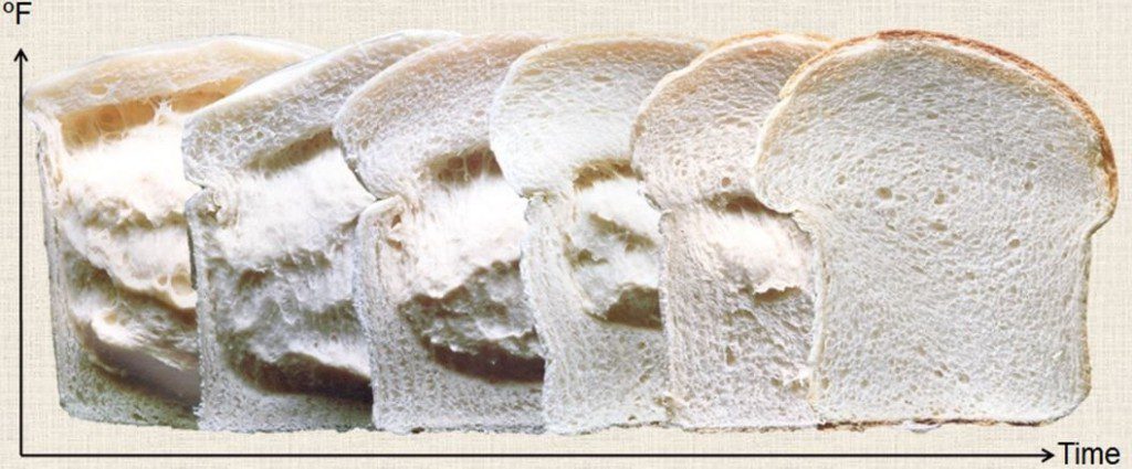 - Wheat starch gelatinization: starch granules gelatinization onset is at 65°C (150°F) and is concluded at 82°C (180°F). This process should be completed at 60% of total bake time.