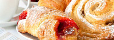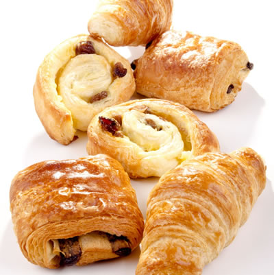 The term pastry primarily refers to either savory or sweet products wrapped in some form of pastry dough. There are many forms of pastry dough, though the most common is shortcrust pastry dough. The basic ingredients of pastry dough are flour, sugar, milk, shortening, baking powder, and eggs. When these ingredients are combined, they form a dough that is flakier or crumblier than bread dough. The high fat content in pastry dough, and how the fat covers the flour used, is what leads to a flaky pastry. Presentation is also more highly valued in pastries, therefore there is typically more time spent on making this product. This leads to a more expensive product.