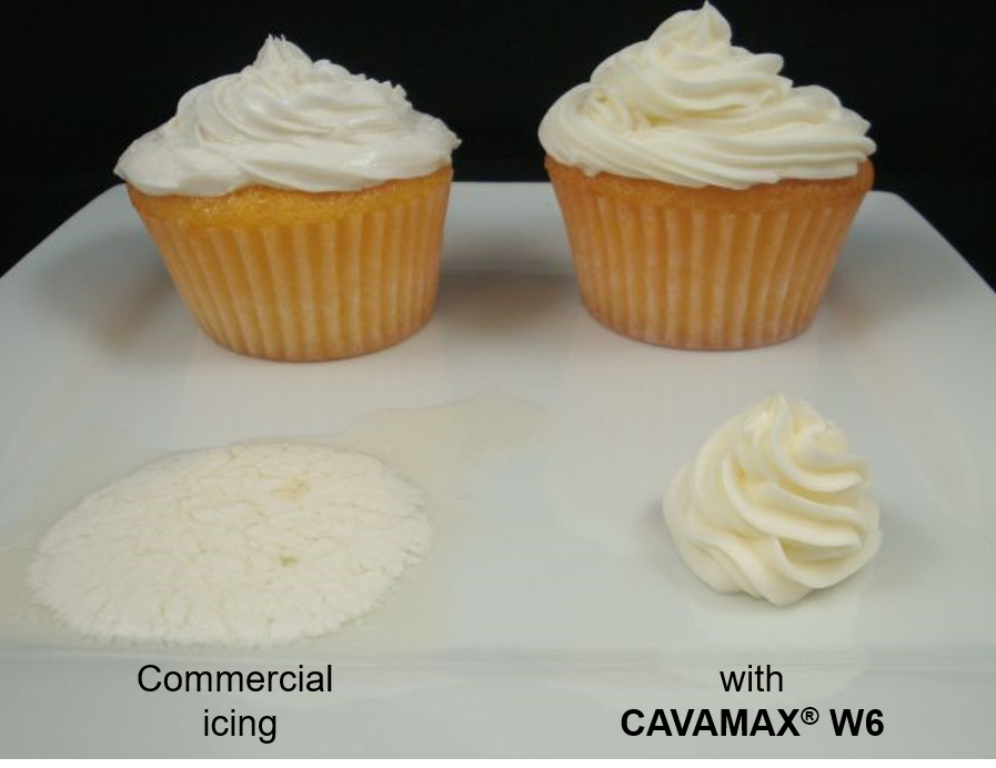 The cyclodextrin ring has a lipophilic cavity and a hydrophilic outer layer. The lipophilic cavity can interact with fatty acids from triglycerides and the resulting structure can effectively acts as an emulsifier to stabilize various emulsions. This unique functionality can be attributed to making a better heat stable frosting or icing, and improving spreadability with CAVAMAX® W6.