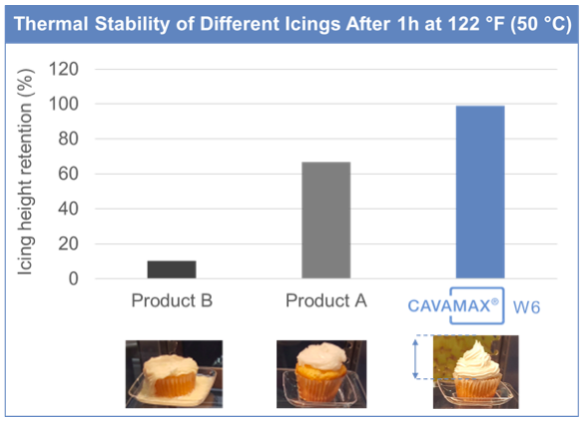 In both icings and frostings, CAVAMAX® W6 has impressive results. Most varieties, such as buttercream, royal icing and boiled icing are mainly composed of sugar and fat with a small amount of water. CAVAMAX® W6 helps to form a stable emulsion. It also allows the finished product to have a thermal stability and consistent viscosity that’s spreadable at ambient and refrigerated temperatures.
