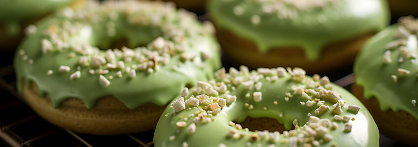 Close-up of green tea matcha doughnuts covered with green matcha powder icing and grated pistachio on a cooling rack, matcha dessert. Home made Pistachio donuts, ready to eat. Doughnuts banner