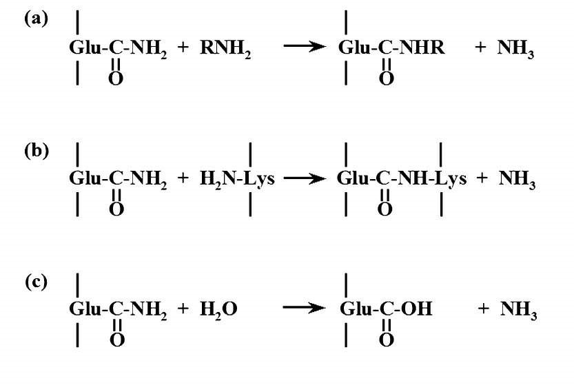 Figure 1 – Transglutaminase mode of action. a) Acyl transfer, b) Crosslinking of Gln and Lys residues in proteins or peptides, c) Deamidation.