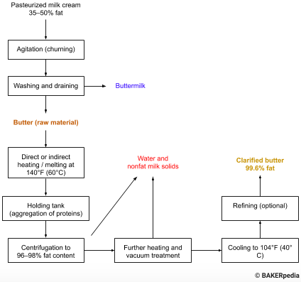 Clarified butter makes use of thermal and physical processes. Butter is first heated, centrifuged and vacuum-treated.4 The following block diagram helps visualize the production process.