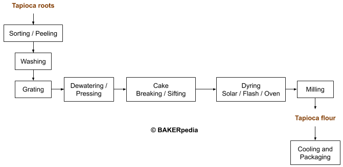 Tapioca flour is produced on a commercial scale from milled dried cassava chips or wet mash. Mashing of cassava root is achieved by grating or milling of peeled roots. The mash obtained in the initial stages can either be fermented or unfermented.