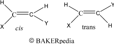 In the trans configuration, the hydrogen atoms on the double bond in a fatty acid chain are opposite each other. As a result the chain is nearly straight (with a slight kink at the double bond), as shown in the figure below. The cis-isomers prevail in all the food fats and oils, although small amounts of trans-isomers occur in fats from ruminants.3