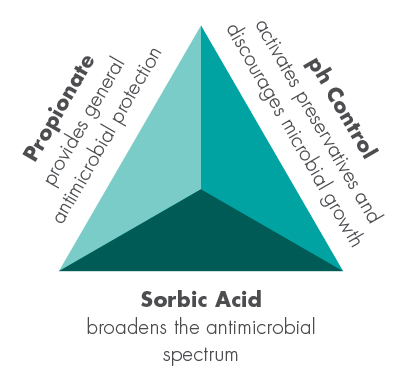 Encapsulation enables the sorbic acid to be added with the other dry ingredients without affecting the products, process, or finished quality, and extends shelf life more than a propionate alone could achieve.4 Used in conjunction with propionate, sorbic acid will protect against microbes that propionates do not address (see Figure 1).4