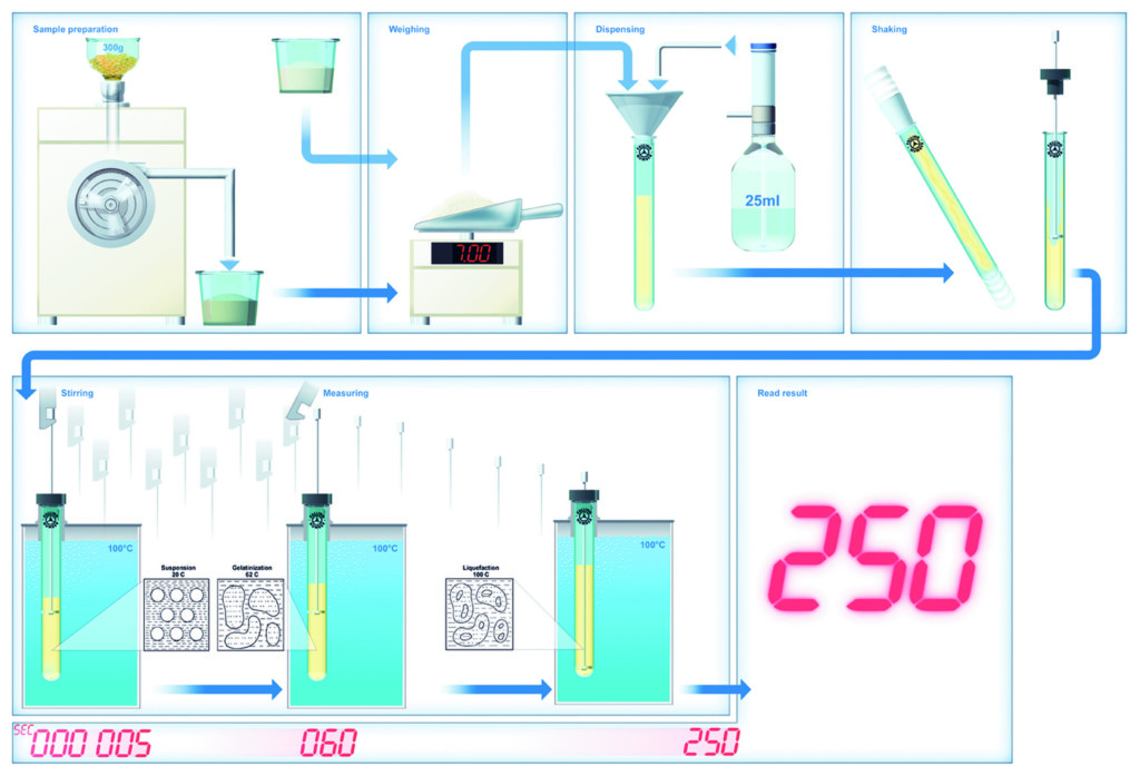 The FN test details the effect of the α-amylase on the starch granules in the flour undergoing gelatinization, and progressively broken down (cleaved) by the amylase action.1 The temperature set for the test provides maximum enzymatic activity in the flour/water mixture or suspension.