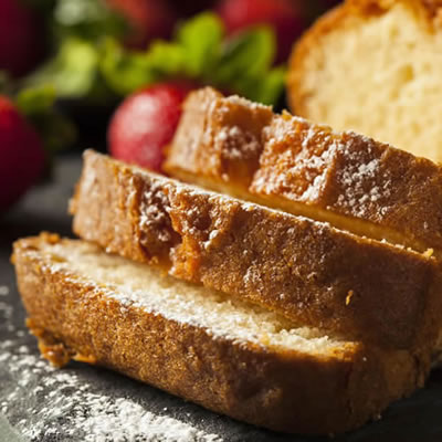 A pound cake is usually baked in loaf form or in a Bundt pan. The simplicity and density of the cake makes it a popular sidekick with fruit or whipped cream. A shortened cake, it has tight grain and elastic crumb.1 Pound cake is often flavored with citrus fruits or vanilla. Sour cream is another new addition to the recipe. It can be topped with a light icing, glaze or dusted with powdered sugar. However, it is rarely heavily frosted.