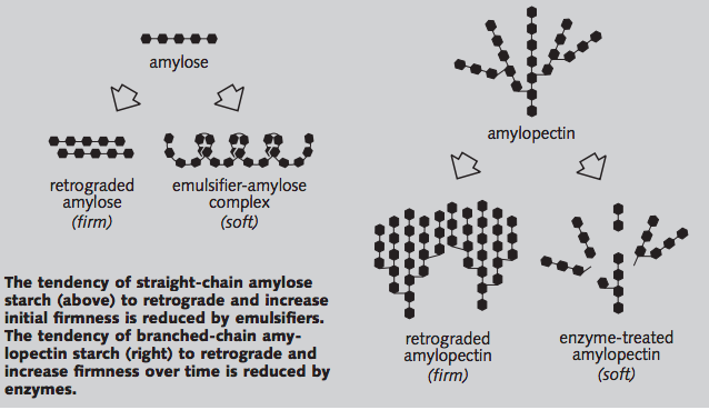 These are used as antistaling agents because they slow the rate of crumb firming in a way that may also slow the rate of moisture migration. Enzymes break down a portion of the starch during processing and baking, so it does not cause as much firmness when it links together during storage. The temperature stability and action pattern of the enzymes are important so that enough branched starch is broken down to inhibit staling, but not so much that the crumb becomes sticky and difficult to slice.