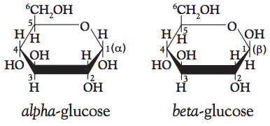D-glucose is the basic building block of starch. Its chemical model is a hexagon made up of one oxygen atom, five carbon atoms (numbered 1 through 5), and two forms (alpha- and beta-) depending on its structure at position 1: