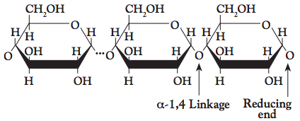 Starch is made up of linear and branched polymers of D-glucose. The linear amylose portion is made up of thousands of glucose units connected by alpha-1,4 linkages: