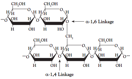 The branched amylopectin portion of starch is made up of a million or more glucose units in groups of twenty to thirty each and connected at branch points by alpha-1,6 linkages: